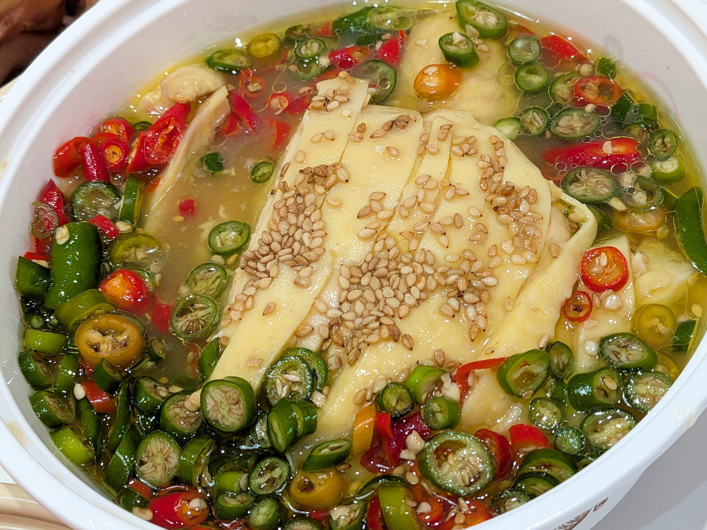 But right at the bottom of the stairway was a tiny enclave with some refrigerated cases and pickling vats that surprised us the most. In its earliest incarnation, it sold Sichuan food of a type rarely seen before. Heretofore, we’d known the cuisine via its baby shrimp in spicy red sauce, tea-smoked duck, and ma po tofu. But this place served many dishes cold – with a major part of the output being pickled vegetables and animal entrails.